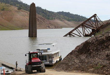 Crews try to pull a houseboat out of the low waters of Lake McClure near a revealed section of the old Barrett Bridge on March 24, 2015 in La Grange, California. More than 3,000 residents in the Sierra Nevada foothill community of Lake Don Pedro who rely on water from Lake McCLure could run out of water in the near future if the severe drought continues. Lake McClure is currently at 7 percent of its normal capacity and residents are under mandatory 50 percent water use restrictions.(AFP)