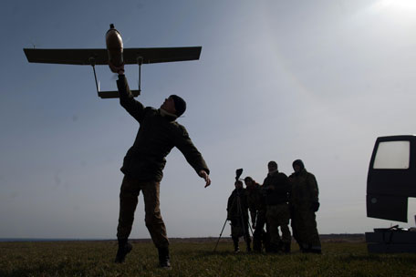 A serviceman launches an unmanned reconnaissance aircraft at the position of the Ukrainian froces near eastern Ukrainian city of Lysychansk, Lugansk region on March 24, 2015. American lawmakers voted overwhelmingly to urge President Barack Obama to provide Ukraine with lethal weapons to defend itself against Russian "aggression." (AFP)