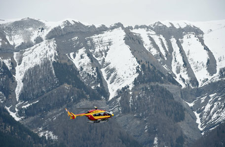 A helicopter of the French civil security services flies near Seyne, south-eastern France, on March 24, 2015, near the site where a Germanwings Airbus A320 crashed in the French Alps. A German airliner crashed near a ski resort in the French Alps on March 24, killing all 150 people on board, in the worst plane disaster in mainland France in four decades. (AFP)