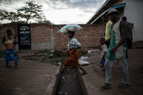 A women crosses a ditch while balancing a bag of grain on her head in Baraka, South Kivu on March 23, 2015. (AFP)