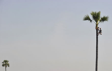 An Indian "toddy tapper", who collects the sap from palm trees to make arrack, climbs a tree with clay pots to fill up the liquid, at Bibi Nagar in Nalgonda District, some 40 kilometers from Hyderabad on March 23, 2015. Natural arrack is extracted from palm trees and prized for its sweet taste, popular during the summer season. (AFP)